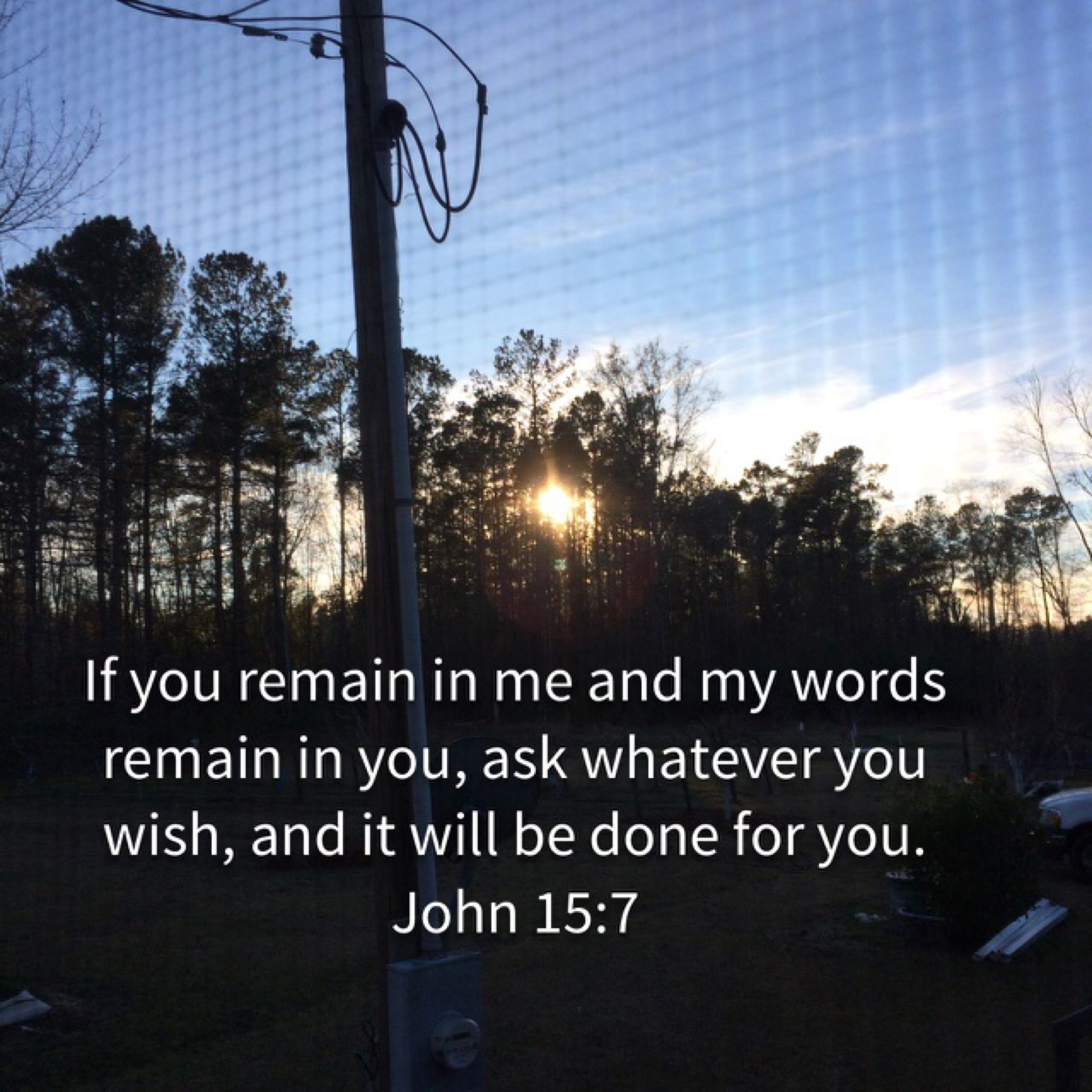 If giving me, a million dollars will further the Kingdom Mission He will do so. But if giving me a million dollars will cause me to walk away from the vine. Then He will not give it to me. Remaining in Him = remaining on the vine and remaining nourished so tat we can produce fruit! He does not want us to wither and die spiritually. He does not want us to become a body sitting in the pew but produces nothing for the furtherance of the Kingdom Mission. He wants us to grow and flourish in Him. Life issues will arise. Still grow and flourish in Him knowing that He will handle the issues in His time.