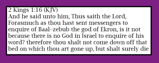 The King of Israel was in trouble. He was ill. He needed to know what the future held fo him. Instead of calling on the Almighty he went to a foreign God. It was an insult to the Almighty. He sent His prophet to pronounce judgment on the King of Israel. I listened to this king’s tenure as ruler of Israel and when I got to this Scripture immediately I considered the numerous ways that we – as Christians – do exactly the same thing. We go to psychics when we need answers instead of God. We will ask electronic apps for guidance instead of God. We will look to horoscopes for our daily “fortunes” instead of God. We will take those fortune cookies as a message from God instead of His holy Word. God does not look kindly on His children when we give the authority over our lives to anything and anyone other than Him. We tend to do that with pastors, priests, rabbis, self-defined prophets, and so many others who have set themselves up as a conduit between God and His people. We forget that when Christ died on the cross the veil was ripped into two parts. The wall of separation between God and His people disappeared. They no longer needed a go-between. Christ stands as our intercessors between us and God. No human being can forgive sin, predict our lives, and or predict the will of God over our lives. Only God is supreme. Let us ensure that we do not make the mistake that the King of Israel made in this Scripture.