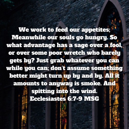 I love Solomon. He is so real. Live and enjoy life. Grow where you are planted and all will be well. Many times we are looking for the greener grass when in fact it is simply a reflection of our thoughts and not a reality of life! It is His breath in our lungs. Not smoke!