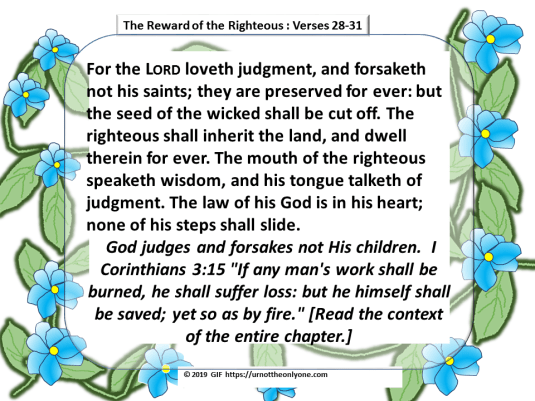 Verses 29-31 speak to the lifestyle of a righteous man. According to Lawson 2004, David reminded the righteous to turn from evil and do good. This is a call for a lifestyle of repentance, separation, and holiness. A person who does this will always live securely, knowing God’s protection and provision. David was assured that God would not forsake his faithful ones. The wicked would be cut off in judgment, but the righteous would be protected forever and inherit and dwell in the land throughout future generations (p. 212).
