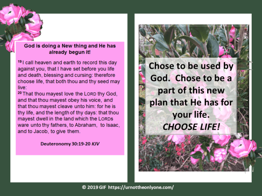 He tells us to choose life! A life filled with trials yes, but also a life filled with the fulfillment of His promises to us. He does not promise us eternal life in this moral body! Step out into the freshness of His Holy Presence and choose to be His instrument of peace in this world. Chose to be used by Him, because He can use anything to do His will!