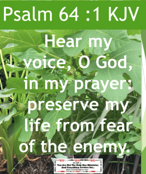 1 Hear my voice, O God, in my prayer: preserve my life from fear of the enemy. David knows that fear is a destructive emotion. Fear of one’s enemies rather than trust in God and a healty fear or awe of God leaves a believer without the power and strength of the Lord. When we pray we must not pray for our own desires but we must pray according to the will of God. As a child of God our prayers keep us close contact with God. When we pray we pray for His will to be done in a situation. We pray for the benefit of others and not for their destruction. We pray that His will be done in their lives.