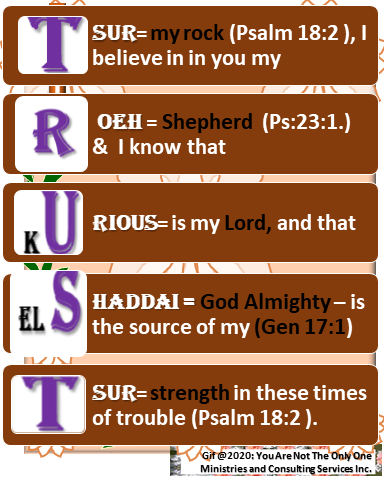 Prayer: Lord all may appear to be bleak. The blackness of life and this disease may be creeping into the recesses of our souls but we will trust you. We will stand on your word. We have trusted you in sickness, want, during deep troubles before and you have always been there for us. This very breath that we breathe does not belong to us. You gave it to us on the day that we were born. We know that it will return to you when YOU determine that our life’s journey is over. Until then I will TRUST in you to supply all of my needs according to your riches in glory. I do pray for the sick of heart, the informed of spirit, and the wondering thoughts od my brothers and sisters all over the world. Your name is YHYH Rophe= the Lord our healer. I believe it, receive it and grasp unto it in Jesus’ name AMEN AND AMEN!
