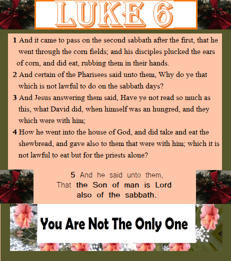 Deuteronomy 23:25 says: “When thou comest into the standing corn of thy neighbor, then thou mayest pluck the ears with thine hand; but thou shalt not move a sickle unto thy neighbor’s standing corn.” This is how the poor were fed back then. They didn’t need food stamps because the Law of the Lord and the Land made provision for them to be FED. Not so today. Deuteronomy is the retelling of God’s law for His people. His social justice systems and His religious expectations for them. So when the Pharisees saw him “working on the Sabbath” they were miffed. They did NOT understand that HE governed the Sabbath. Those laws were set in place to “force” the people to set aside a time of worship.