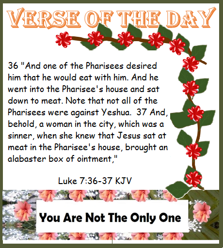 36 “And one of the Pharisees desired him that he would eat with him. And he went into the Pharisee’s house and sat down to meat. Note that not all of the Pharisees were against Yeshua. 37 And, behold, a woman in the city, which was a sinner, when she knew that Jesus sat at meat in the Pharisee’s house, brought an alabaster box of ointment,” The sinner recognized the Yeshua has come. See Matt. 26:6-13; Mark 14:3-9; John 12:2-8. This incident that took place in Galilee and involved “a woman … who was a sinner,” i.e., a prostitute. Please understand that there is no reason to identify this woman as Mary Magdalene. It is not her. 38 And stood at his feet behind him weeping, [This infers that He was reclining at a low table, that was the custom of the time. “and began to wash his feet with tears, and did wipe them with the hairs of her head, and kissed his feet, and anointed them with the ointment. Her “weeping” indicated her repentance. 39 Now when the Pharisee which had bidden him saw it, he spake within himself, saying, This man, if he were a prophet, would have known who and what manner of woman this is that toucheth him: for she is a sinner. The Pharisees saw her sin. They did not see her repentant heart. They did not have any compassion for her nor the ability to see how repentant she was. Simon had not committed sins like hers. Therefore, he couldn’t get it.