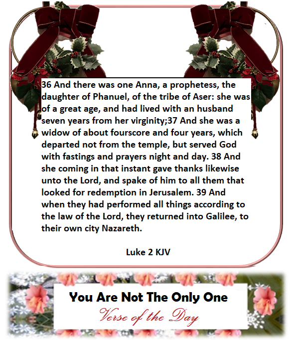 36 And there was one Anna, a prophetess, the daughter of Phanuel, of the tribe of Aser: she was of a great age, and had lived with an husband seven years from her virginity;37 And she was a widow of about fourscore and four years, which departed not from the temple, but served God with fastings and prayers night and day. 38 And she coming in that instant gave thanks likewise unto the Lord, and spake of him to all them that looked for redemption in Jerusalem. 39 And when they had performed all things according to the law of the Lord, they returned into Galilee, to their own city Nazareth. 40 And the child grew, and waxed strong in spirit, filled with wisdom: and the grace of God was upon him.