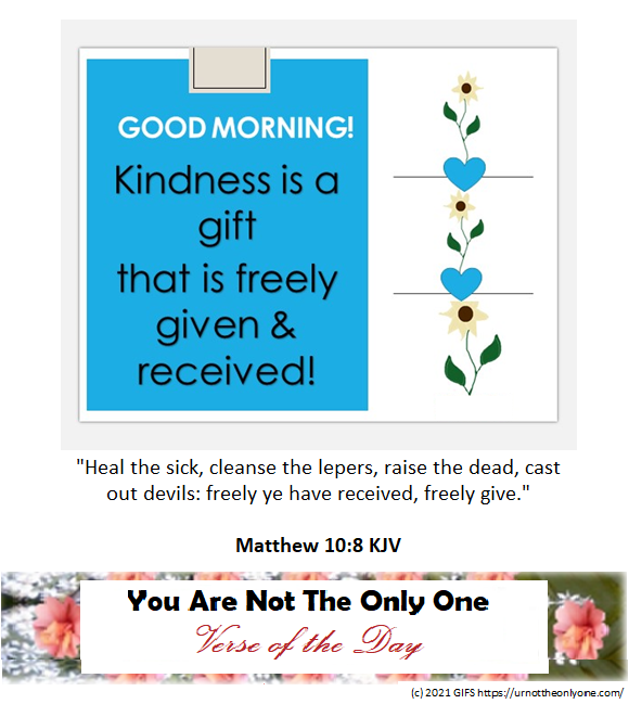 Be kind to others in Jesus name and.. “Heal the sick, cleanse the lepers, raise the dead, cast out devils: freely ye have received, freely give.” Matthew 10:8 KJV There are many people in this world with diseased hearts, sick souls, and dead emotions. The enemy has them in his grasp. Won’t you share some of Jesus with them? Let them know that they are not outcasts! Be Kind! Speak kind words! Speak only what Jesus would speak! Trust Him with everything else! He is still sovereign!