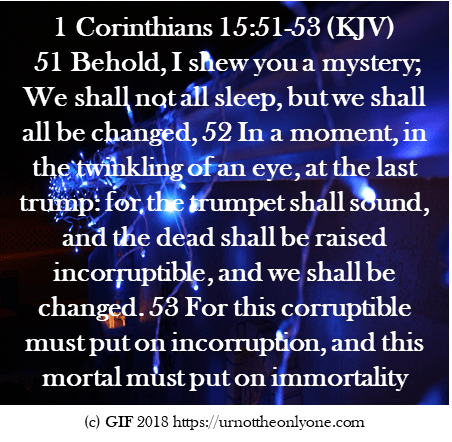 1 Corinthians 15:51-53 King James Version (KJV) 51 Behold, I shew you a mystery; We shall not all sleep, but we shall all be changed, 52 In a moment, in the twinkling of an eye, at the last trump: for the trumpet shall sound, and the dead shall be raised incorruptible, and we shall be changed. 53 For this corruptible must put on incorruption, and this mortal must put on immortality.