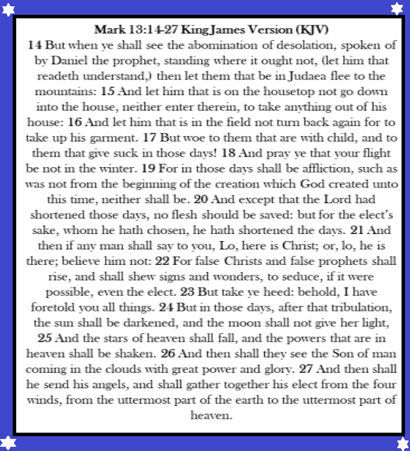 Mark 13:14-27 King James Version (KJV) 14 But when ye shall see the abomination of desolation, spoken of by Daniel the prophet, standing where it ought not, (let him that readeth understand,) then let them that be in Judaea flee to the mountains: 15 And let him that is on the housetop not go down into the house, neither enter therein, to take anything out of his house: 16 And let him that is in the field not turn back again for to take up his garment. 17 But woe to them that are with child, and to them that give suck in those days! 18 And pray ye that your flight be not in the winter. 19 For in those days shall be affliction, such as was not from the beginning of the creation which God created unto this time, neither shall be. 20 And except that the Lord had shortened those days, no flesh should be saved: but for the elect’s sake, whom he hath chosen, he hath shortened the days. 21 And then if any man shall say to you, Lo, here is Christ; or, lo, he is there; believe him not: 22 For false Christs and false prophets shall rise, and shall shew signs and wonders, to seduce, if it were possible, even the elect. 23 But take ye heed: behold, I have foretold you all things. 24 But in those days, after that tribulation, the sun shall be darkened, and the moon shall not give her light, 25 And the stars of heaven shall fall, and the powers that are in heaven shall be shaken. 26 And then shall they see the Son of man coming in the clouds with great power and glory. 27 And then shall he send his angels, and shall gather together his elect from the four winds, from the uttermost part of the earth to the uttermost part of heaven.