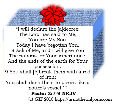 - Psalm 2:7-9: “I will declare the [a]decree: The Lord has said to Me, ‘You are My Son, Today I have begotten You. 8 Ask of Me, and I will give You The nations for Your inheritance, And the ends of the earth for Your possession. 9 You shall [b]break them with a rod of iron; You shall dash them to pieces like a potter’s vessel.’