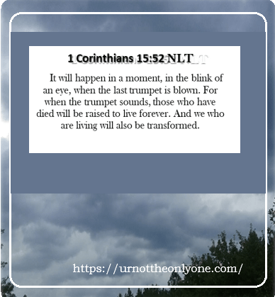 - NLT 52 It will happen in a moment, in the blink of an eye, when the last trumpet is blown. For when the trumpet sounds, those who have died will be raised to live forever. And we who are living will also be transformed.