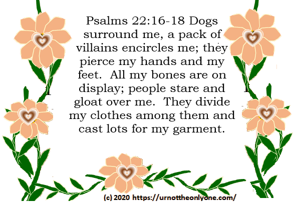 - Psalms 22:16-18 Dogs surround me, a pack of villains encircles me; they pierce my hands and my feet. All my bones are on display; people stare and gloat over me. They divide my clothes among them and cast lots for my garment. Read Chapter All Versions