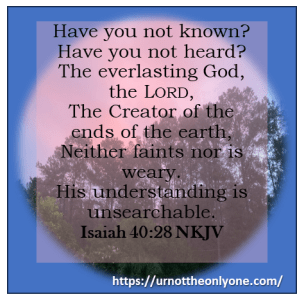 I praise You for this new day. You are the Creator of the universe, and you know all things. Isaiah declared, and so do I, “Have you not known? Have you not heard? The everlasting God, the Lord, The Creator of the ends of the earth, Neither faints nor is weary. His understanding is unsearchable.” Isaiah 40:28