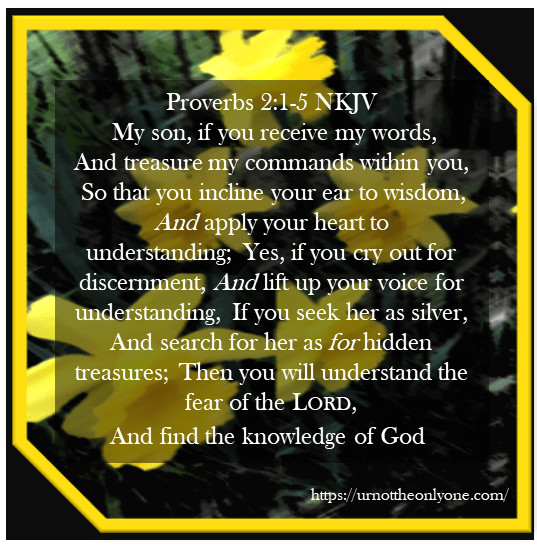 My son, if you receive my words and treasure my commands within you so that you incline your ear to wisdom and apply your heart to understanding; yes, if you cry out for discernment And lift up your voice for understanding, if you seek her as silver, And search for her as for hidden treasures; then you will understand the fear of the Lord, And find the knowledge of God. Proverbs 2:1-5 NKJV