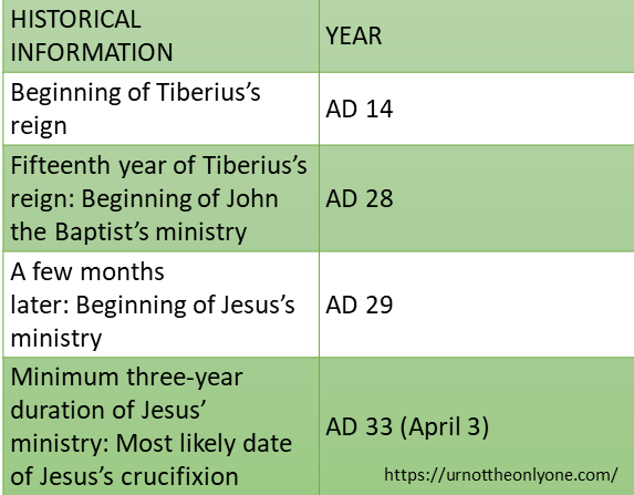 We know from Roman historians that Tiberius succeeded Augustus as emperor and was confirmed by the Roman Senate on August 19, AD 14. He ruled until AD 37. “The fifteenth year of the reign of Tiberius Caesar” sounds like a straightforward date, but there are some ambiguities, beginning with when one starts the calculation. Most likely, Tiberius’s reign was counted either from the day he took office in AD 14 or from January 1 of the following year, AD 15. The earliest possible date at which Tiberius’s “fifteenth year” began is August 19, AD 28, and the latest possible date at which his “fifteenth year” ended is December 31, AD 29. So John the Baptist’s ministry began anywhere from mid-AD 28 until sometime in AD 29.