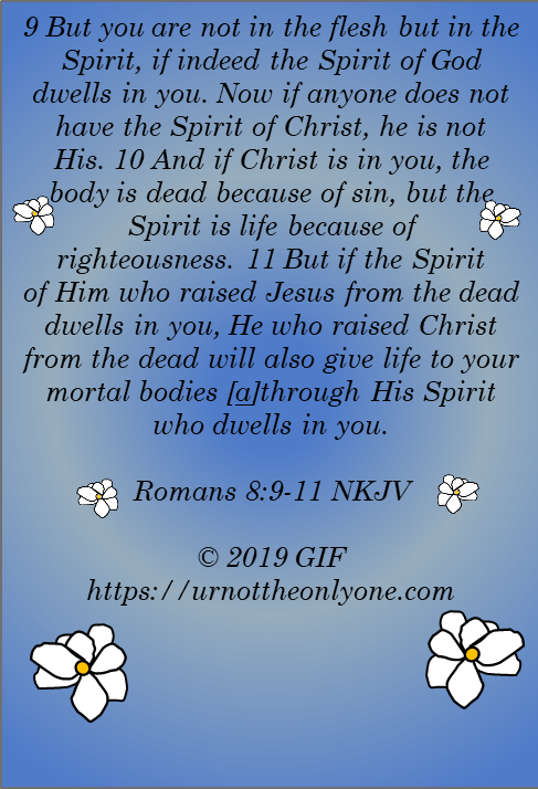 9 But you are not in the flesh but in the Spirit, if indeed the Spirit of God dwells in you. Now if anyone does not have the Spirit of Christ, he is not His. 10 And if Christ is in you, the body is dead because of sin, but the Spirit is life because of righteousness. 11 But if the Spirit of Him who raised Jesus from the dead dwells in you, He who raised Christ from the dead will also give life to your mortal bodies [a]through His Spirit who dwells in you. Romans 8:9-11 NKJV