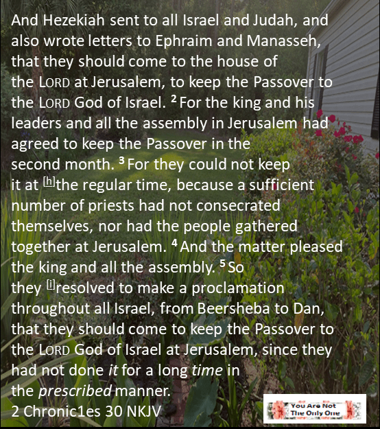 – And Hezekiah sent to all Israel and Judah, and also wrote letters to Ephraim and Manasseh, that they should come to the house of the Lord at Jerusalem, to keep the Passover to the Lord God of Israel. 2 For the king and his leaders and all the assembly in Jerusalem had agreed to keep the Passover in the second month. 3 For they could not keep it at [h]the regular time, because a sufficient number of priests had not consecrated themselves, nor had the people gathered together at Jerusalem. 4 And the matter pleased the king and all the assembly. 5 So they [i]resolved to make a proclamation throughout all Israel, from Beersheba to Dan, that they should come to keep the Passover to the Lord God of Israel at Jerusalem since they had not done it for a long time in the prescribed manner. 2 Chronicles 30 READ ON