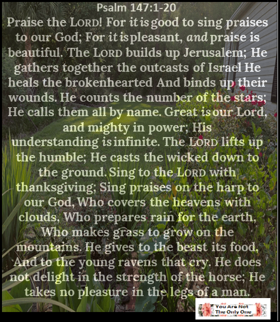 Praise the Lord! For it is good to sing praises to our God; For it is pleasant, and praise is beautiful. The Lord builds up Jerusalem; He gathers together the outcasts of Israel He heals the brokenhearted And binds up their wounds. He counts the number of the stars; He calls them all by name. Great is our Lord, and mighty in power; His understanding is infinite. The Lord lifts up the humble; He casts the wicked down to the ground. Sing to the Lord with thanksgiving; Sing praises on the harp to our God, Who covers the heavens with clouds, Who prepares rain for the earth, Who makes grass to grow on the mountains. He gives to the beast its food, And to the young ravens that cry. He does not delight in the strength of the horse; He takes no pleasure in the legs of a man.