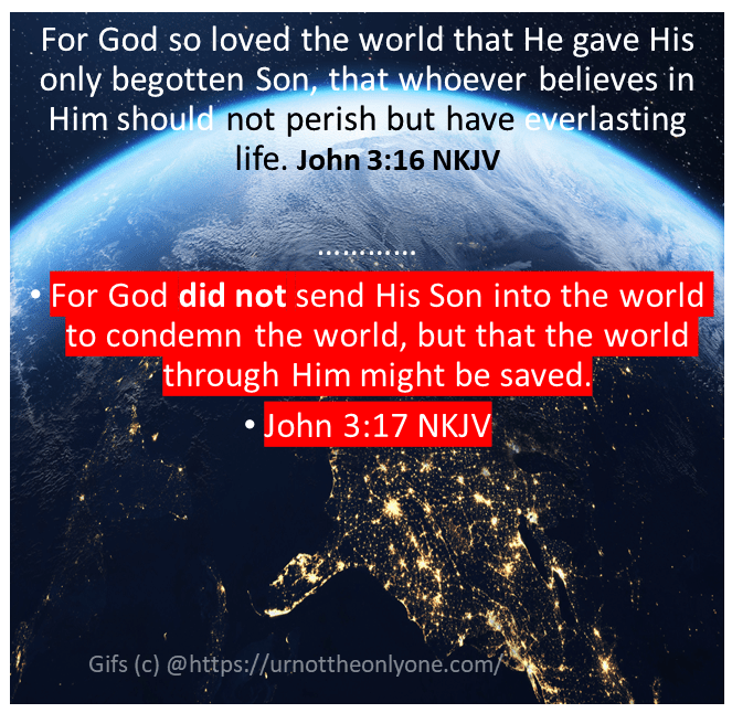 John 3:16-18 ESV “For God so loved the world, that he gave his only Son, that whoever believes in him should not perish but have eternal life. For God did not send his Son into the world to condemn the world, but in order that the world might be saved through him. Whoever believes in him is not condemned, but whoever does not believe is condemned already, because he has not believed in the name of the only Son of God.