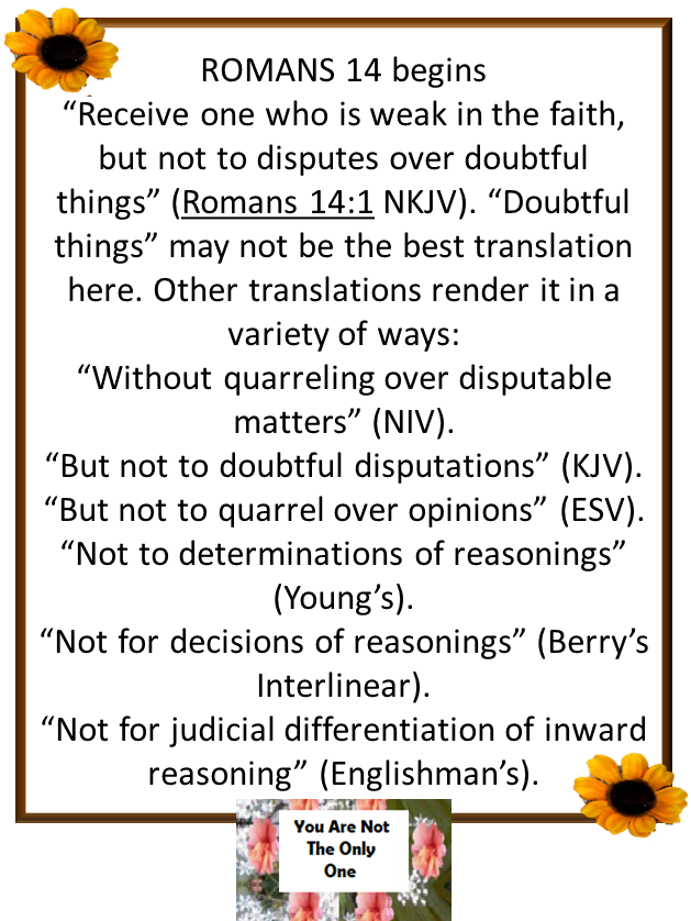 The chapter begins, “Receive one who is weak in the faith, but not to disputes over doubtful things” (Romans 14:1 NKJV). “Doubtful things” may not be the best translation here. Other translations render it in a variety of ways: