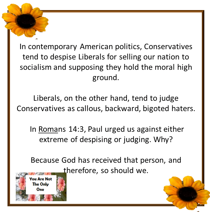 Those with the freedom to eat meat tended to despise those who didn’t eat as being pitifully bound by rules that were nailed to the cross of Christ. Those who didn’t eat meat that was tainted by idolatrous associations judged those who did eat as being naively ignorant and having a seared conscience. The same thing still happens today. When it comes to disputable matters, the issues almost always divide into two groups. How do the two groups view each other? One group despises while the other judges. This despise/judge tendency is clearly evident in almost all the cultural issues polarizing society today. I’ll illustrate my meaning with political examples..