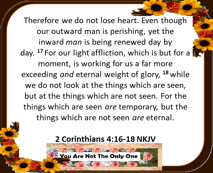 Therefore we do not lose heart. Even though our outward man is perishing, yet the inward man is being renewed day by day. 17 For our light affliction, which is but for a moment, is working for us a far more exceeding and eternal weight of glory, 18 while we do not look at the things which are seen, but at the things which are not seen. For the things which are seen are temporary, but the things which are not seen are eternal. 2 Corinthians 4:16-18 NKJV