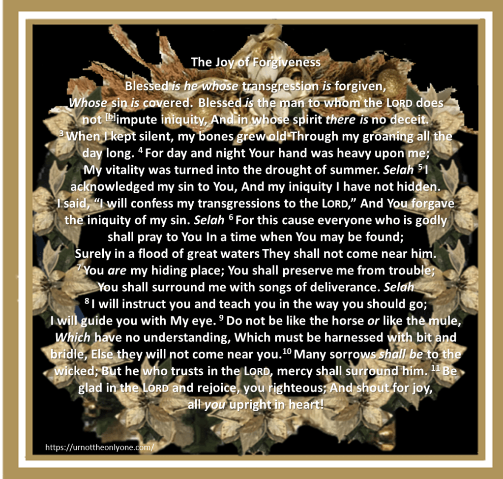 His prayer of repentance is codified in one of the most beautiful Psalms ever written- Psalm 51. Even though David had sinned, he never stopped praising Yahweh for the “Joy of forgiveness” he received when he prayed the prayer codified in Psalm 32. Theologians believe that Psalm 32 was written at the same time as Psalm 51.