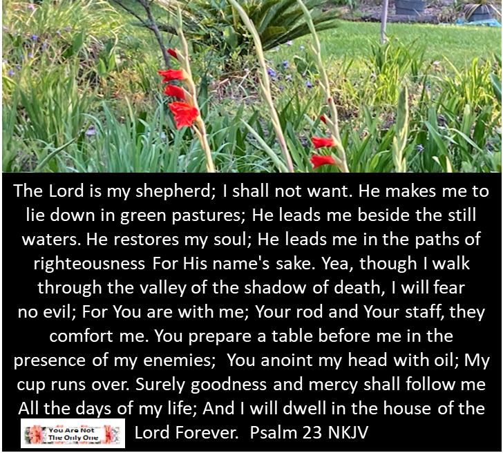 The Lord is my shepherd; I shall not want. He makes me lie down in green pastures; He leads me beside the still waters. He restores my soul; He leads me in the paths of righteousness For His name’s sake. Yea, though I walk through the valley of the shadow of death, I will fear no evil, For You are with me; Your rod and Your staff, they comfort me. You prepare a table before me in the presence of my enemies; You anoint my head with oil; My cup runs over. Surely goodness and mercy shall follow me, all the days of my life, and I will dwell in the house of the Lord forever.​ Psalm 23