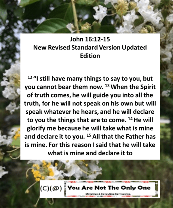 confines of impermanence and uncertainty. However, like the disciples, we’re not left to ourselves. Jesus says the Spirit of Truth accompanies us through whatever we’re facing. Let’s read the next two passages from