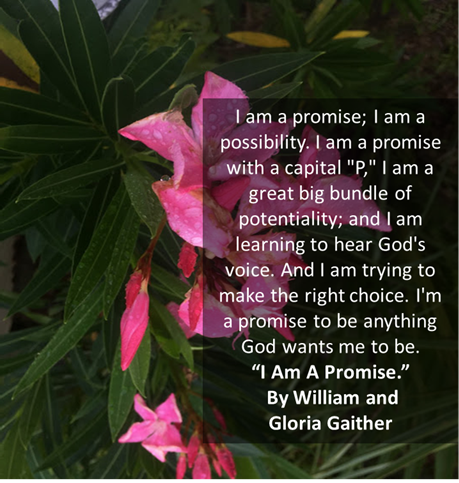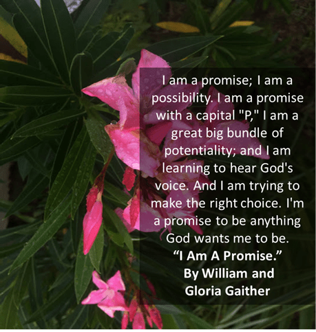 I am a promise; I am a possibility. I am a promise with a capital “P.” I am a great big bundle of potentiality, and I am learning to hear God’s voice. And I am trying to make the right choice. I’m a promise to be anything God wants me to be. I Am A Promise By William and Gloria Gaither.