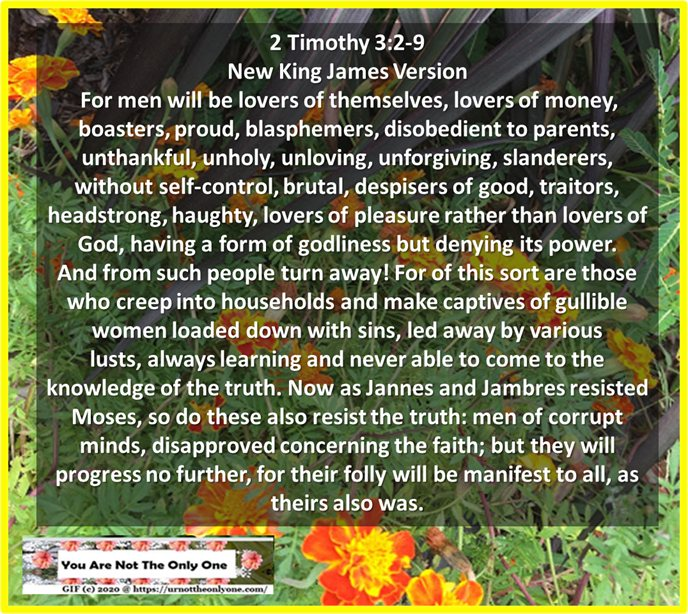 “For men will be lovers of themselves, lovers of money, boasters, proud, blasphemers, disobedient to parents, unthankful, unholy, unloving, unforgiving, slanderers, without self-control, brutal, despisers of good, traitors, headstrong, haughty, lovers of pleasure rather than lovers of God, having a form of godliness but denying its power. And from such people turn away! For of this sort are those who creep into households and make captives of gullible women loaded down with sins, led away by various lusts, always learning and never able to come to the knowledge of the truth. Now, as Jannes and Jambres resisted Moses, so do these also resist the truth: men of corrupt minds, disapproved concerning the faith; but they will progress no further, for their folly will be manifest to all, as theirs also was.” 2 Timothy 3:2-9 NKJV