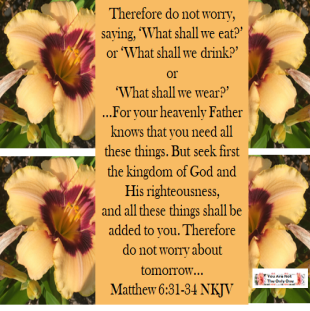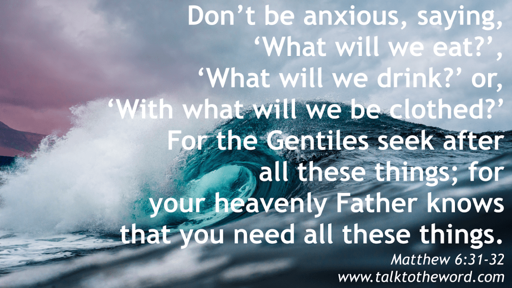 1. Matthew 6:25-34 “Therefore I say to you, do not worry about your life, what you will eat or what you will drink; nor about your body, what you will put on. Is not life more than food and the body more than clothing? Look at the birds of the air, for they neither sow nor reap nor gather into barns; yet your heavenly Father feeds them. Are you not of more value than they? Which of you by worrying can add one [a]cubit to his [b]stature? “So why do you worry about clothing? Consider the lilies of the field, how they grow: they neither toil nor spin; and yet I say to you that even Solomon in all his glory was not [c]arrayed like one of these. 30 Now if God so clothes the grass of the field, which today is, and tomorrow is thrown into the oven, will He not much more clothe you, O you of little faith? “Therefore do not worry, saying, ‘What shall we eat?’ or ‘What shall we drink?’ or ‘What shall we wear?’ For after all these things the Gentiles seek. For your heavenly Father knows that you need all these things. But seek first the kingdom of God and His righteousness, and all these things shall be added to you. Therefore do not worry about tomorrow, for tomorrow will worry about its own things. Sufficient for the day is its own trouble.”