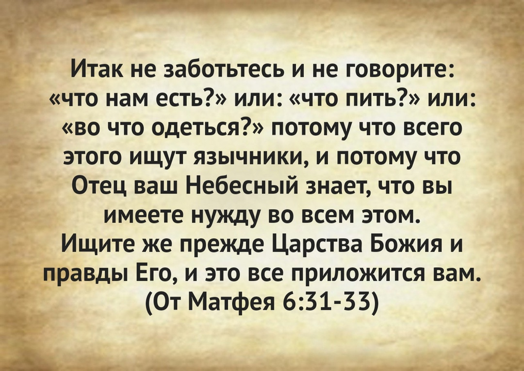 • От Матфея 6:31 Russian Synodal Version “Итак не заботьтесь и не говорите: что нам есть? или что пить? или во что одеться?”