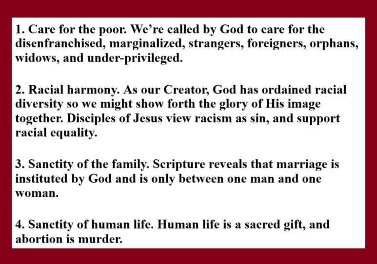 - First, political priorities are dividing believers. For example, a pastor of a racially diverse congregation told me his biggest challenge right now is people leaving his local church because they disagree with the political priorities of other believers in the congregation. Scripture calls us to stand resolutely for four values that are currently politically charged issues in America…