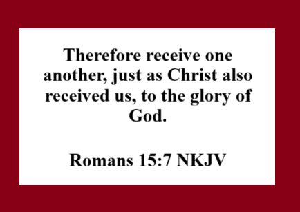 - Therefore receive one another, just as Christ also received us, to the glory of God (Romans 15:7).