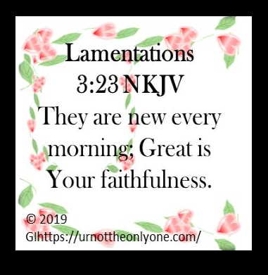May all I do bring glory to You and Your kingdom. I pray that our local and national leaders also honor You in their actions. Fill our children’s minds with Your wisdom as they learn each day. Let the Holy Spirit guide their choices in school and draw their hearts to know You. Abba, thank You for Your great faithfulness. Lamentations 3:23 NKJV. https://biblehub.com/lamentations/3-23.htm
