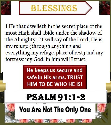 1 He that dwelleth in the secret place of the most High shall abide under the shadow of the Almighty. I will say of the Lord, He is my refuge (through anything and everything my refuge: place of rest) and my fortress: (1 Peter 1:5 He keeps us secure and safe in His arms) my God; in him will I trust. Why do you trust Him? Answer this question for yourself and them write this verse down, and your answer as to why you trust Him, on something. Decorate it. Now place it somewhere where you will see it every day. When the threat of violence, the virus that is currently permeating the earth, begin to make your feel threatened, read it aloud and remind yourself who Yah is to you-personally.